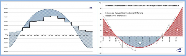 Rechts: Differenz zwischen der maximalen monatliche Bodentemperatur in Potsdam und dem maximalen örtlichen S-B-Temperaturäquivalent
