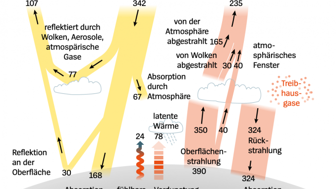 In ihrer energetischen Bilanzbetrachtung der Erde wurde die solare Einstrahlung von 1368 W/m² der Sonne, wie so oft, auf die gesamte Erdhülle über den Faktor 1/4 (da die Sonne auf eine virtuelle Kreisfläche strahlt, und die Kugeloberfläche mit dem gleichen Radius 4 x größer ist) verteilt. Die Wissenschaftler Kiehl und Trenberth übernehmen das Modell und verfeinern es.