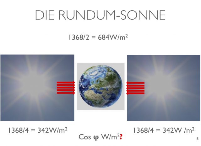 Außerdem bezieht die 1/4 Verteilung der solaren Einstrahlung auf die gesamte Atmosphärenhülle stets die kalte Nachtseite mit ein und entspricht einem solaren Modell mit 2 Sonnen, halber Abstrahleistung und die Erde in Ihrer Mitte. Zusätzlich widerspricht dies der korrekten Anwendung des Stefan-Boltzmann Gesetzes.