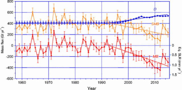 Abbildung 1: D = Eisberge und andere Ozean-Wechselwirkungen, SMB = Oberflächen-Massenbilanz (Schnee-Akkumulation minus Abschmelzen), MB = Gesamt-Massenbilanz (Van den Broeke et al. (2017)