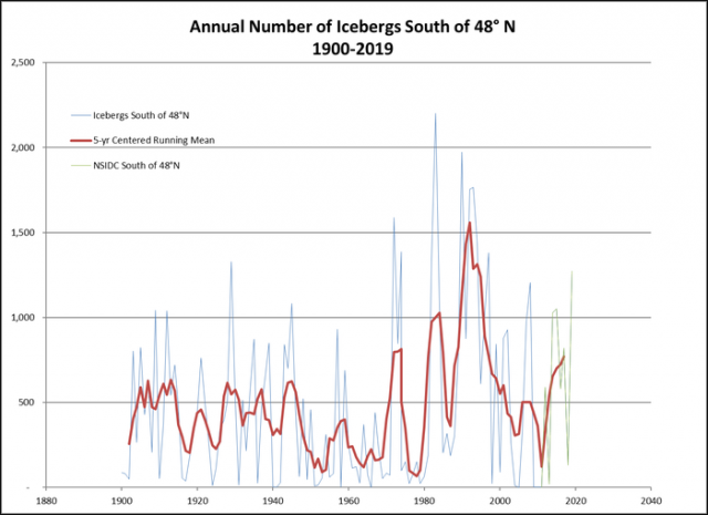Abbildung 3: Anzahl von Eisbergen südlich von 48°N (US-Küstenwache und NSIDC). International Ice Patrol. 1995, updated 2020. International Ice Patrol (IIP) Iceberg Sightings Database, Version 1. [G00807]. Boulder, Colorado USA. NSIDC: National Snow and Ice Data Center. doi: https://doi.org/10.7265/N56Q1V5R. [Accessed 2 Feb 2020].