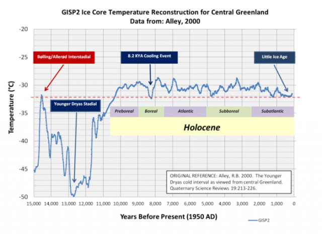 Vielleicht ist es der „beispiellosen“ Erwärmung der Arktis geschuldet, dass die Eisberge schmelzen, bevor sie den 48. Breitengrad erreichen. Nun, in der Arktis gibt es nur wenige langzeitliche „Thermometer“ … Eisbohrkerne aus Grönland. Die Grönland-Temperaturrekonstruktion, oft zitiert von Skeptikern, stammt aus dem GISP2-Bohrkern (Alley 2000).