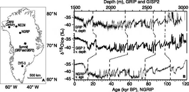 Yau, Audrey M., Michael L. Bender, Alexander Robinson, Edward J. Brook. “Last interglacial in the GISP2 Greenland ice core”. Proceedings of the National Academy of Sciences. Aug 2016, 113 (35) 9710-9715; DOI: 10.1073/pnas.1524766113