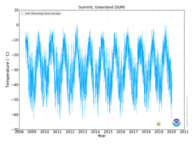 Kobashi zufolge lag die mittlere Temperatur an der Summit Station während der letzten 4000 Jahre bei -30,7°C. Die mittlere Temperatur seit 2008 lag um -30°C.