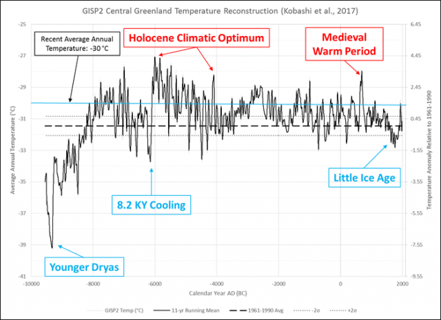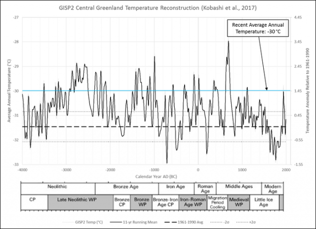 Die geschätzte mittlere Schnee-Temperatur in Grönland während der letzten 4000 Jahre betrug -30,7°C mit einer Standardabweichung von 1,0°C. Sie weist einen langzeitlichen Rückgang von grob 1,5°C auf, was konsistent ist mit früheren Studien. Die gegenwärtige dekadische Mitteltemperatur (2001 bis 2010) am GISP2-Messpunkt beträgt -29,9°C.
