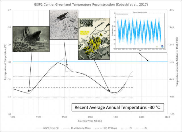 Abbildung 7c: GISP2-Temperatur-Rekonstruktion seit dem Jahr 1900. Markiert sind die Vorgänge RMS Titanic, Glacier Girl, The Ice Age Cometh? Sowie die Temperaturen an der Summit Station, um die Größenordnung zu erkennen.