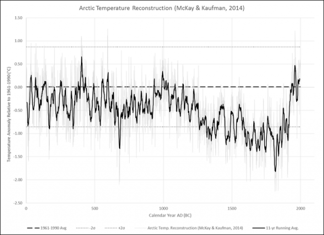 Also betrachten wir doch einmal die Temperatur-Rekonstruktion der Arktis von McKay & Kaufman (2014).