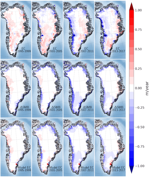Wir zeigen zum Beispiel, dass der Eisschild seit Anfang der 2000er Jahre fast überall dünner geworden ist. Für einen Eisschild im Gleichgewicht mit dem lokalen Klima erwarten wir, in der Mitte eine geringe Zunahme der Höhe der Oberfläche Jahr für Jahr zu sehen sowie eine Abnahme an den Rändern, da in höher gelegenen Regionen mehr Schnee fällt als wieder abschmilzt und es in tieferen Schichten umgekehrt ist. Allerdings zeigen die Wissenschaftler hier, dass der Eisschild inzwischen fast überall dünner wird (blaue Gebiete in der oberen Reihe). „Es ist ziemlich bemerkenswert, derartige Änderungen während der letzten Jahre zu sehen im Vergleich zu Anfang der 1990er Jahre“, sagte Sebastian Simonsen vom DTU.