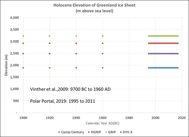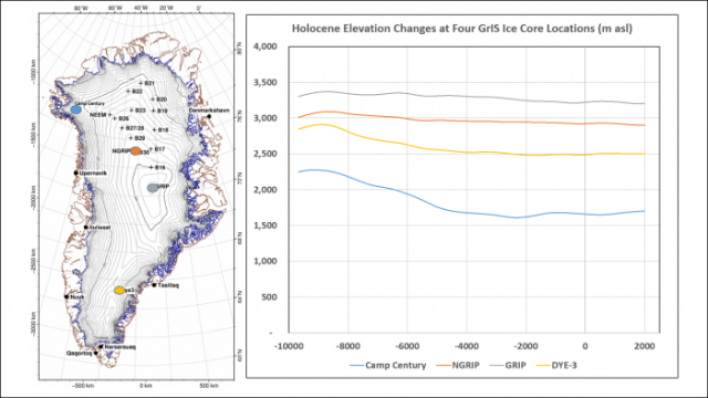 Vinther, B.M., S.L. Buchardt, H.B. Clausen, D. Dahl-Jensen, S.J. Johnsen, D.A. Fisher, R.M. Koerner, D. Raynaud, V. Lipenkov, K.K. Andersen, T. Blunier, S.O. Rasmussen, J.P. Steffensen, and A.M. Svensson. (2009). “Holocene thinning of the Greenland ice sheet”. Nature. 461. 385-8. 10.1038/nature08355.