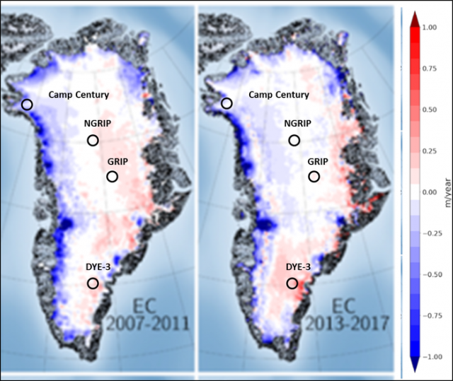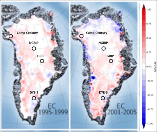 Auf der Grundlage der Schätzungen der Massenbilanz von Mouginot zeigten sich sehr geringe Gesamtänderungen von 1960 bis 1995, dem Anfangsjahr der Höhenänderungskarten des Polar Portals. Ich habe die Höhenänderungskarten vergrößert und die Stellen der Eisbohrkerne eingetragen.