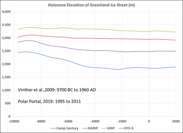 Wie verhält sich der jüngste Schmelzvorgang relativ zum übrigen Holozän? Kurze Antwort: „Genauso wie immer!“ Vinther et al. (2009) rekonstruierten die Höhe von vier Stellen über das Holozän, an denen Eisbohrkerne gezogen worden waren. Es gab kaum Höhen-Änderungen an den Stellen im Inneren (NGRIP und GRIP), während an den beiden äußeren Stellen (Camp Century und DYE3) jeweils 546 bzw. 342 m Höhe eingebüßt haben.