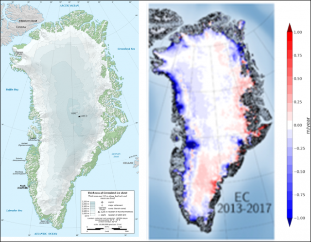 Abbildung 13: Isopachenkarte des grönländischen Eisschildes von Eric Gaba – Wikimedia Commons user: Sting (links) und Höhenänderungskarte des Polar Portals (rechts).