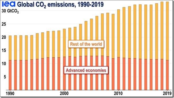 Es stellt sich die Frage, ob die jahrzehntelange heiße Luft, die durch die IPCC Konferenzen der Klima-Genozider erzeugt wurde und die sowohl enorme Kosten als auch Beeinträchtigung des gesunden Menschenverstand verursacht hat, den Anstieg der globalen CO2 -Emissionen unter die von IPCC übliche Prognose “business-as-usual“ gesenkt hat. – First Assessment Report im Jahr 1990.
