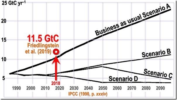 Die Antwort lautet Nein. Die jährliche, offizielle, von Experten überprüfte Schätzung der globalen CO2 -Emissionen aus allen Quellen, Friedlingstein et al. (2019), der das gleiche breitere Emissionsmaß wie IPCC verwendete, zeigt, dass die Emissionen über dem vom IPCC 1990 prognostizierten „business-as-usual“ Anstieg liegen: