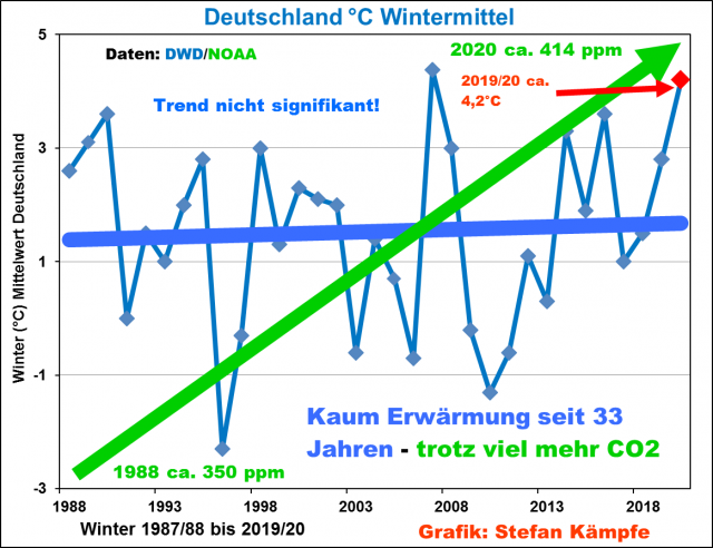 Abbildung 1: Kaum winterliche Erwärmung in Deutschland seit 1987/88 – trotz deutlich steigender CO2-Konzentrationen und des Beinahe-Mittelwertrekords im Winter 2019/20.