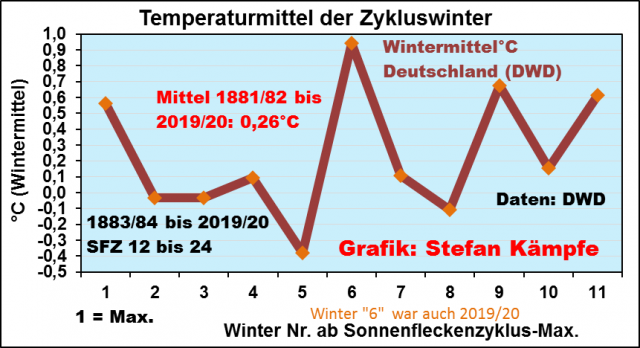 Abbildung 2: Während die Winter 2 bis 5 nach dem Maximum des SCHWABE-Zyklus relativ kühl verliefen, war der sechste herausragend mild; auch die Winter 1, 9 und 11 verliefen tendenziell eher mild.