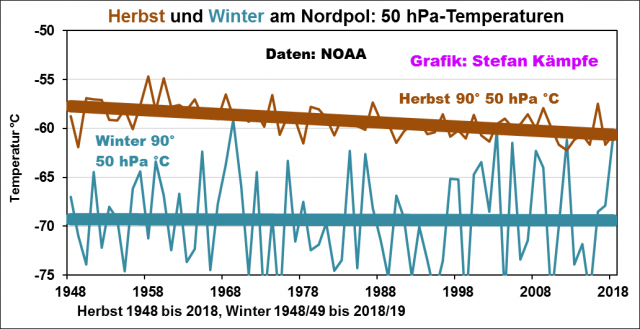 Abbildung 3: Merklicher Rückgang der 50 hPa-Stratosphärentemperatur am Nordpol seit 1948 (keine längere Datenverfügbarkeit) im Herbst; fast kein Trend im Winter. Aber im Winter kann die nachlassende Sonnenaktivität auch keinen direkten Einfluss mehr haben, da die Sonne dann nicht scheint (Erdschatten über dem Pol). Es ist aber denkbar, dass die im Herbst kälter werdende Stratosphäre die Westwind-Zirkulation des Winters „ankurbelt“. Man beachte außerdem, dass hier nur der nördlichste Gitterpunkt betrachtet wurde; der gesamte Polarwirbel ist viel größer und in seiner Form sehr variabel; außerdem beeinflussen auch die QBO und weitere Faktoren, wie er sich verhält.