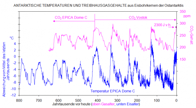 ==> Die Atmosphäre enthält 0,038 % CO2. Nur 3 % davon sind von Menschen freigesetzt. Nach dem Henry-Gesetz folgt der CO2-Gehalt der Luft der Temperatur mit einer Zeitverzögerung