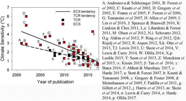 Unter Klima-Sensitivität versteht man die Temperaturzunahme durch eine Verdoppelung des CO2-Gehalts in der Atmosphäre. Sie lässt sich nicht messen. Derzeit steigt der CO2-Gehalt der Luft um 2 ppm im Jahr. Bleibt dieser Wert gleich, verdoppelt sich der CO2-Anteil in 200 Jahren von rund 400 auf 800 ppm. Durch den logarithmischen Zusammenhang (konstante Temperaturzunahme bei einer Verdoppelung des CO2-Gehalts) bewirkt ein Ansteigen des CO2 ein immer geringeres Ansteigen der Temperatur. Die zwischen 2002 und 2017 erstellten Studien ergaben Werte zwischen 0,5°C und 2,5°C (TCR). Nach einem Jahrtausende langen Ausgleich der Temperatur mit den Weltmeeren lassen sie eine Temperatursteigerung zwischen 0,5°C und 6°C (ECS) für das in diesen 200 Jahren freigesetzte CO2 erwarten. Die seit 2000 veröffentlichten Studien erwarten eine immer niedrigere Klimasensitivität.10 Das international anerkannte Modtran-Programm der Atmosphärenphysik berechnet sie mit 1,7°C (für einen Temperaturanstieg von 400 auf 800 ppm)11. 2015 wurde auf der UN-Klimakonferenz in Paris beschlossen, die menschengemachte globale Erwärmung auf deutlich unter 2°C zu begrenzen. Diese politisch willkürlich festgesetzte Grenze wird auch ohne Ausstieg aus fossiler Energie nie überschritten – selbst wenn die wegen abnehmender Sonnenflecken vorausgesagte Abkühlung nicht eintreten sollte.