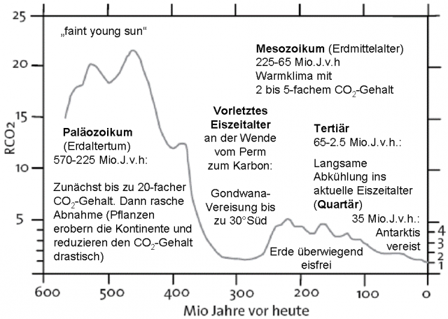 Ähnlich stark schwankte der CO2 Gehalt. Vor gut 4 Milliarden Jahren bestand die Atmosphäre aus 80 % Wasserdampf und 10 % CO2.22 Nach einem Abfall stieg CO2 von 0,6 % vor 570 Millionen Jahren auf 0,8 % vor 460 Millionen Jahren. Im Kambrium breiteten sich die Pflanzen aus und bildeten sich alle Tierstämme. Dabei sank das CO2 auf 0,044 % während der Gondwana-Vereisung vor 280 Millionen Jahren. Es stieg auf 0,2 % vor 210 Millionen Jahren, als die Erde weitgehend eisfrei war.23 Seither nimmt es im Wesentlichen ab. Fast die gesamte Erdgeschichte hatte die Luft mehr CO2 als heute. Coccolithophoriden – das Kalknannoplankton – binden das überschüssige im Meer gelöste CO2. Dabei können sich diese winzigen Algen24 nahezu unbegrenzt vermehren. Sie haben Kalkgebirge aufgebaut. Nicht nur die Steinbildung, sondern auch Chitinpanzer von Insekten und Pilzen binden CO2. Heutzutage ist nur mehr so wenig CO2 in der Atmosphäre, dass viele Gärtner CO2 in ihre Gewächshäuser einbringen, damit die Pflanzen besser wachsen. Das Optimum liegt je nach Sorte zwischen 0,06 % und 0,16 %25. In spätestens einer halben Million Jahren wird so wenig CO2 in der Luft sein, dass die Pflanzen die Photosynthese nicht mehr ausführen und keine höheren Tiere und schon gar keine Menschen auf der Erde leben können.