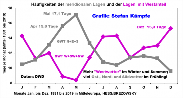 Wieder ein ausgezeichneter Beitrag. Bliebe höchstens noch Folgendes zu ergänzen: Das bevorzugte Auftreten meridionaler Wetterlagen im Frühjahr und Herbst spiegelt sich auch in einer anderen Statistik, nämlich der so genannten „5b-Tiefs“, die vom Mittelmeer kommend über das östliche Mitteleuropa hinweg nach Norden bis Nordwesten ziehen. Sie sind an meridionale Wetterlagen gekoppelt.