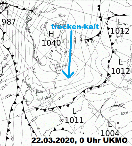 Weil aber die Sonne zum Frühlingsanfang noch nicht sehr viel Kraft hat, kann sie die aus Nordosten einfallende Kaltluft (Luftmassen xA und cP) kaum erwärmen; klirrend kalte Nächte und windig-kalte Sonnentage sind die Folge. Auch das angeblich erwärmend wirkende Klimagas CO2 konnte uns nicht vor dieser Kälte bewahren. Ohne Datumsangabe könnte man die Abbildung 2b auch für eine winterliche Hochdruckwetterlage halten; die Luftdruckwerte sind für diese weit fortgeschrittene Jahreszeit bemerkenswert hoch. Aber im Winter hätte uns „Stalins letzte Rache“, wie der verheerend kalte Nordostwind gerne auch genannt wird, eine gefrierende Ostsee bei Nachts strengstem und selbst tagsüber mäßigem Dauerfrost beschert. Doch warum gibt es bei ähnlichem Sonnenstand zum Herbstanfang im September niemals derartige Kältewellen? Eigentlich müsste doch der nach dem Sommer etwas geringere CO2-Gehalt der Luft eine Abkühlung fördern. Aber einerseits hat der Boden noch viel sommerliche Wärme gespeichert; doch vor allem der Bewölkungsgang und der Wasserdampfgehalt der Luft machen den Unterschied. Im Frühherbst ist die Luft absolut viel feuchter, denn die Vegetation transpiriert noch. Oft bildet sich nachts wärmender Nebel oder Hochnebel; tagsüber scheint nach Nebelauflösung die Herbstsonne. Ende März gibt es noch keine die Luft befeuchtende Vegetation; nach den klaren Frostnächten sorgen tagsüber außerdem der infolge der Konvektion auffrischende Wind und manchmal auch Quellwolken für nur geringe Erwärmung. Wesentlich ist nun auch der Zeitpunkt der Witterungsumstellung: Erfolgt er erst später im April, so konnte sich die Festlandsluft schon stärker erwärmen; die Nachtfröste fallen dann schwächer aus oder fehlen ganz.