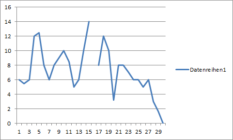 6, 5.5, 6, 12, 12.5, 8, 6, 8, 9, 10, 8.5, 5, 6, 10, 14, ein Tag fehlt, 8, 12, 10, 3.2, 8, 8, 7, 6, 6, 5, 6, 3, 1.7, 5.5.