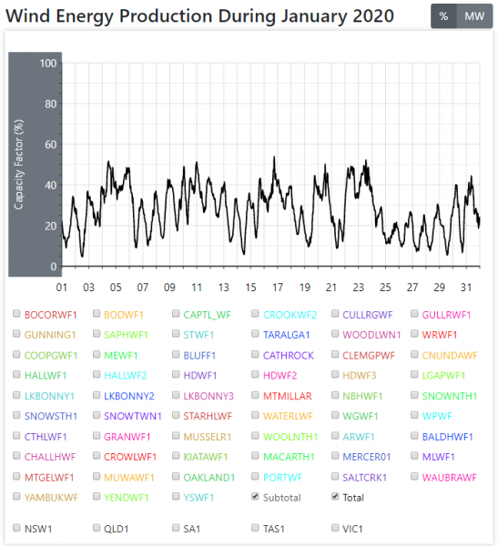 Eine der häufigsten Illusionen, die sich unter dem Dach der Klimakapriole ausbreiten, wie Garth Paltridge es nennt, ist die Idee, dass Sonne und Wind Kohle ersetzen könnten, um zum richtigen Zeitpunkt genügend Strom zu erzeugen. Die brutale Realität ist, dass die intermittierenden Anbieter „Erstickungspunkte“ erleben, wenn die Sonne nicht scheint und der Wind kaum weht. Offensichtlich hat die Sonne jede Nacht dienstfrei, und die auf der Website des australischen Energiemarketing-Betreibers verfügbaren Aufzeichnungen zeigen, dass der Wind in Südostaustralien mehrmals im Monat pausiert. https://anero.id/energy/wind-energy