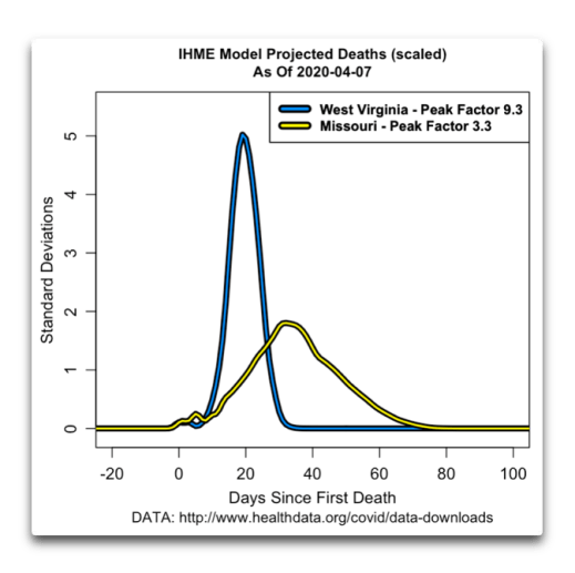 Beginnen wir also hier mit ein paar [US-]Staaten mit sehr unterschiedlichen Peak Factors von zwei Enden der Skala. Die Graphik zeigt die Kurvenverläufe, aber nicht die tatsächlichen Größenordnungen der täglichen Todeszahlen in den beiden Staaten.