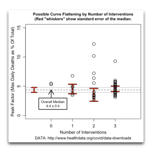 Als Nächstes betrachtete ich den Spitzen-Faktor aller Staaten im Vergleich zur Anzahl der verordneten Restriktionen, um herauszufinden, ob die Eingriffe dazu neigten, die Spitzen niedriger und die Kurve flacher zu machen. Abbildung 2 zeigt das Ergebnis: