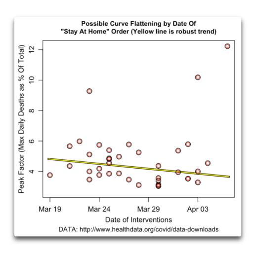 Also interessierten mich jetzt die Zeitpunkte der drei Arten von Eingriffen – bleibt zu Hause, schließt Schulen und Geschäftszweige. Vielleicht gibt es da eine Relation. Zunächst folgen hier die Peak Factors der verschiedenen Staaten im Vergleich zum Timing ihrer Verordnung „bleibt zu Hause“. Mit der Zeit sollte diese Intervention zu niedrigeren Peak Factors führen, wobei der Vorteil sich umso eher ergibt, je früher die Verordnung erlassen worden ist. Das Ergebnis sieht so aus:
