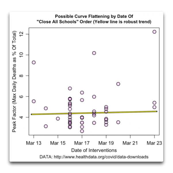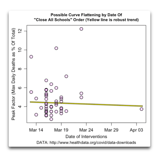 Trotz der statistischen Signifikanz der Trendlinie jedoch läuft sie in die falsche Richtung. Je früher die Einführung, umso weniger ausgeprägt sollte die Spitze sein, nicht umgekehrt. Und hier noch die gleichen Erkenntnisse bzgl. der Schließung von Schulen: