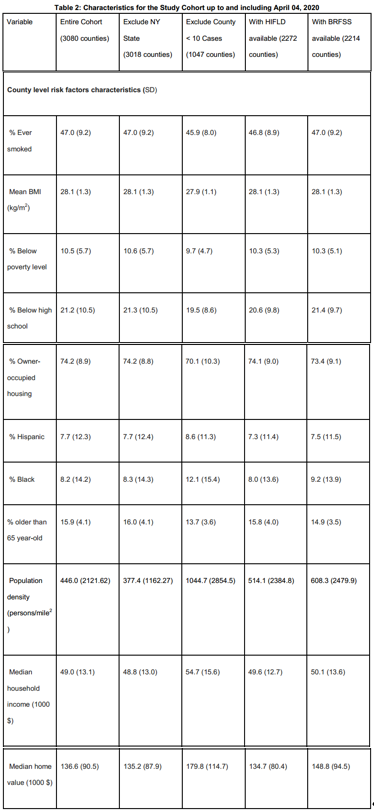 Results: Our study utilized data from 3,080 counties, of which 2,395 (77.8%) have reported zero COVID-19 deaths at the time of this analysis. Table 2 describes the data used in our analyses. Al COVID-19 death counts are cumulative counts up to April 4, 2020.