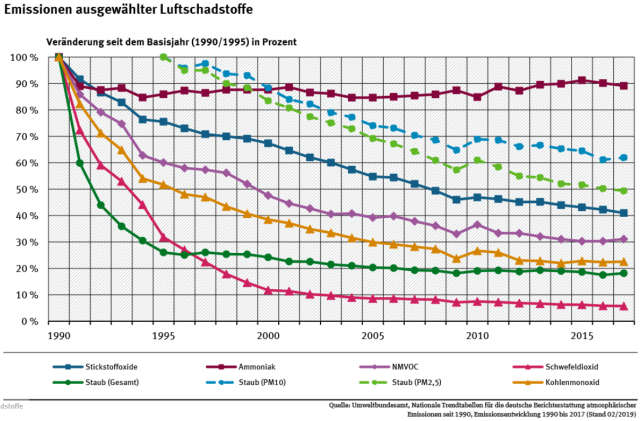 Bild 8.2 Beispiel Deutschland: Relative Veränderungen von Luftschadstoffen in Deutschland über die Jahre. Quelle: UBA