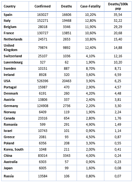 Gut, in Italien mit seiner extrem hohen Mortalität von 32 % auf 100.000 Einwohner soll es vor allem (auch) daran liegen, dass die Betroffenen gerade nicht in Seniorenheimen wohnen, sondern zuhause im Kreis ihrer Großfamilien. Ein Beispiel, wie es für den gleichen Sachverhalt zwei gegensätzliche Korrelationen gibt und Beispiel, dass eine Korrelation keine analytische Aussage ersetzt, oder/und zu Fehlinterpretationen verführt.