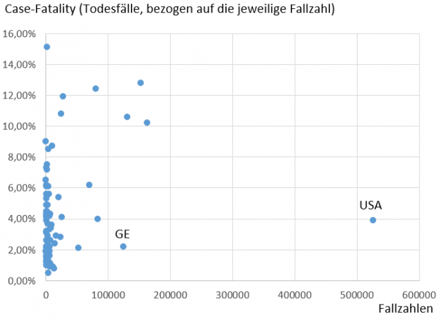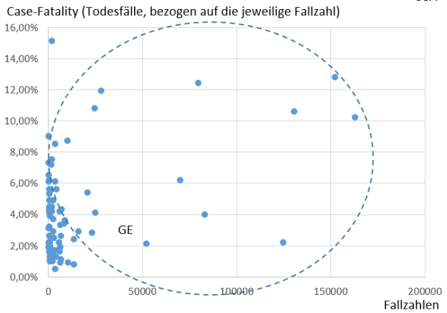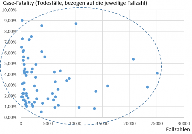 Zum Beispiel zeigt die internationale, auf die Anzahl der Fälle bezogene Mortalitätsrate eher Unregelmäßigkeit (wenig Zusammenhang, also keine Korrelation), was bedeutet: Die Summe an Infizierten in einem Land hat keinen Zusammenhang auf die Mortalitätsrate. Und das gilt sowohl für große, mittlere und kleine Fallzahlen.
