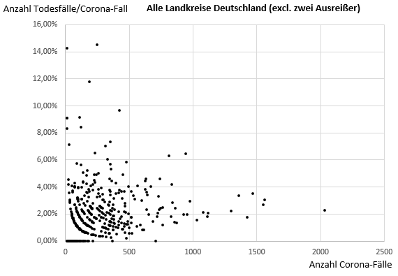 Der Autor hat (orientierende) „Auswertungen“ für alle Landkreise mit mindestens 100 Coronafällen gemacht, was eine statistisch auswertbare Anzahl von 305 Landkreisen ergibt.