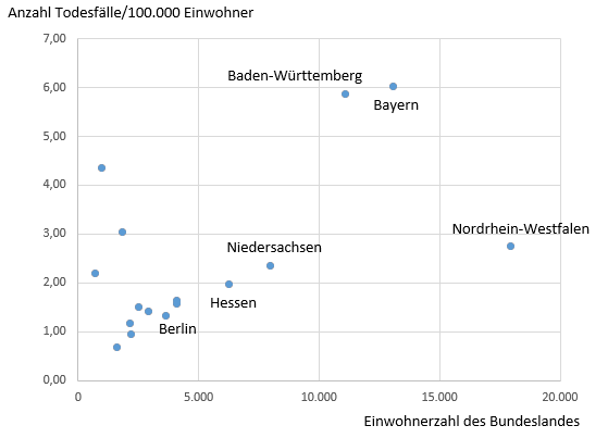 Auch scheint es (zumindest in Deutschland) keine gute Korrelation zwischen der Einwohnerzahl und der Coronamortalität zu geben (Bild 11.5).