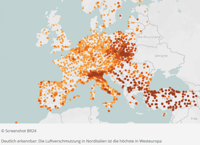 Die Karte der Europäischen Umweltagentur EEA ist eindeutig: Italien hat im Vergleich zu anderen westeuropäischen Staaten die am stärksten belastete Luft. Vor allem die Region Norditalien, die besonders stark von der Corona-Pandemie betroffen ist, hat eine historisch hohe Luftverschmutzung aufzuweisen. Die EEA nimmt für ihre Berechnung der Luftverschmutzung Stickstoffdioxid (NO2), Feinstaub und bodennahes Ozon zusammen – alles Faktoren, die im stark industrialisierten und eng besiedelten Norden Italiens zu finden sind.