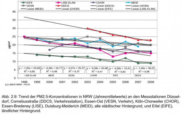 Bild 21 Bundesland NRW. Verlauf der PM2.5-Konzentration an verschiedenen Verkehrs- und Landmessstellen seit 1998. Die Jahresmittelwerte haben je nach Messort einen Bereich zwischen 30 … 10 Mikrogramm/m³