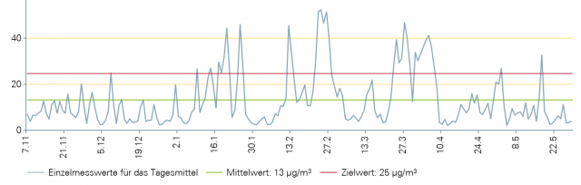 Verlauf der Feinstaub-Konzentration über den Messzeitraum vom 7. November 2012 bis 28. Mai 2013: Einzelmesswerte für das Tagesmittel, der Mittelwert und der Zielwert über den gesamten Messzeitraum. Quelle: BLfU Bayern. Bericht Luftgüte im Bad Heilbrunn, 2014