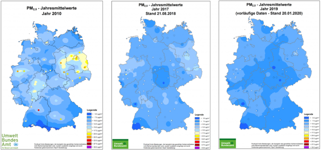 Bild 23 Deutschland, Verteilung des Feinststaubwertes PM2.5 in den Jahren 2010; 2017; 2019. Quelle: UBA Jahresberichte