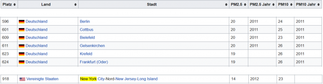 Viele Städte in Deutschland (WIKIPEDIA listet 70 Städte, welche ein höheres PM2.5 Ranking als New York haben) liegen in ihrem Schadstoffranking weit darüber: