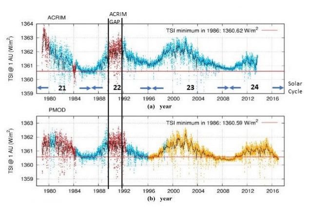 Abbildung 1: Vergleich der TSI-Komposits nach ACRIM und PMOD. Der Graph der ACRIM-TSI (oben) zeigt eine Zunahme von 1986 bis 1997, was mit dem leicht abnehmenden Trend des Graphen des PMOD-Komposits kontrastiert. Der größte Teil dieser Differenz zwischen beiden ist die Art und Weise, wie die „ACRIM-Lücke“ von Mitte 1989 bis August 1991 dargestellt wird. Quelle: Modifiziert aus Scafetta, Willson and Lee et al. 2019, darin deren Abbildung 3