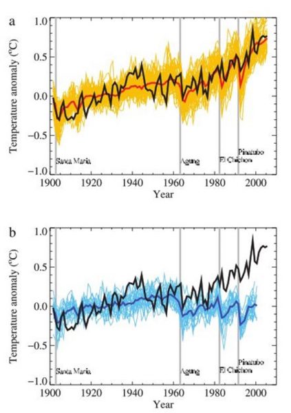 Abbildung 4: Vergleich des Modells einer natürlichen Erwärmung allein (b) und einer Erwärmung aus natürlichen plus menschlichen Ursachen (a) sowie Beobachtungen in schwarz. Quelle: IPCC 2007, S. 684)