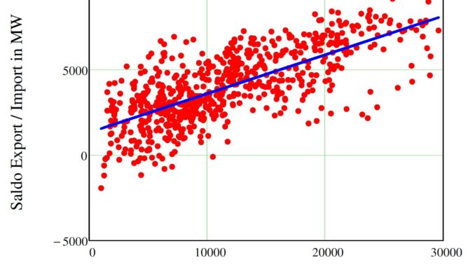 Ja, das ist die exportierte Leistung im Saldo, d.h. Export minus Import, denn meistens wird gleichzeitig exportiert (meist im Norden und Osten) und importiert (im Westen, vor allem im Südwesten). Aussage dieser Grafik ist, dass bei höherem Aufkommen von EE-Strom mehr exportiert wird (bis zu den negativen Preisen). Der Notexport ist also durch den enormen Anfall an Wind- und Solarstrom verursacht, nicht durch „inflexible“ oder „verstopfende“ Kraftwerke. Mfg Frank Hennig