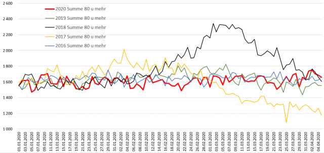 Bild 4 Deutschland, Personen ab 80. Verlauf der absoluten Sterbezahlen vom 01.01. bis 05.04., Jahre 2016 – 2020. Das „Coronajahr“ 2020 in Rot. Alle Werte auf den Startwert des Jahres 2020 normiert. Grafik vom Autor anhand der Daten des Statistischen Bundesamtes erstellt