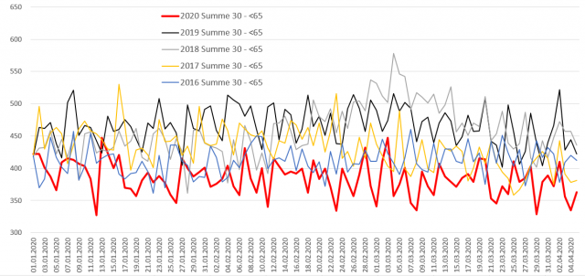 Bild 3 Deutschland, Personen bis 65. Verlauf der absoluten Sterbezahlen vom 01.01. bis 05.04., Jahre 2016 – 2020. Das „Coronajahr“ 2020 in Rot. Alle Werte auf den Startwert des Jahres 2020 normiert. Grafik vom Autor anhand der Daten des Statistischen Bundesamtes erstellt