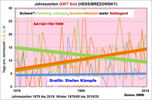 Abbildungen 6a und 6b: Langfristig bis auf den Sommer weniger, ab 1979 besonders im Herbst, doch auch im Frühling, mehr Ostlagen. Zwar sind nicht alle Ostwetterlagen zu trocken; besonders in Süd- und Ostdeutschland können sie mitunter auch reichlichere Niederschläge bringen; doch gerade im Frühling/Sommer neigen sie eher zu anhaltender Trockenheit; zwischen Ende Mai und August sind sie fast stets zu warm, von etwa Mitte Oktober bis Ende März fast stets zu kalt; in den Übergangsjahreszeiten neigen sie zu Nacht- und Bodenfrösten.