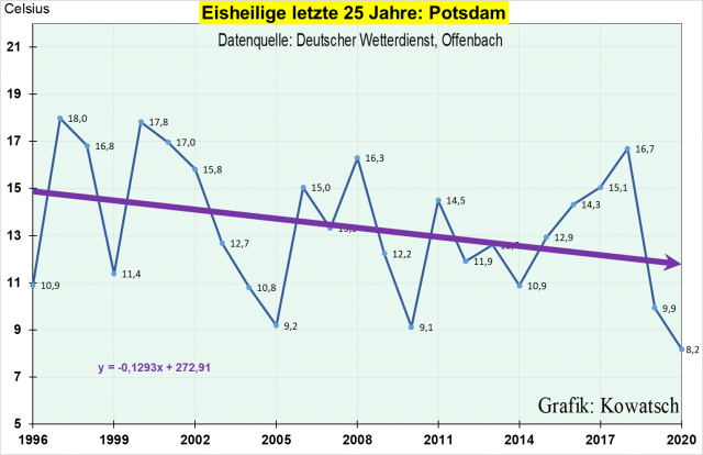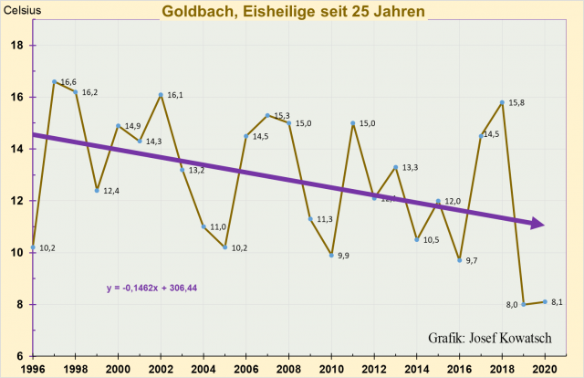 2)die Eisheiligen sich für einen längeren Zeitraum (fast drei Jahrzehnte) genau entgegengesetzt zu dem verhalten, was uns mit der „CO2-Klimakatastrophe“ beständig bei jeder Wetterkapriole gebetsmühlenartig eingetrichtert wird,